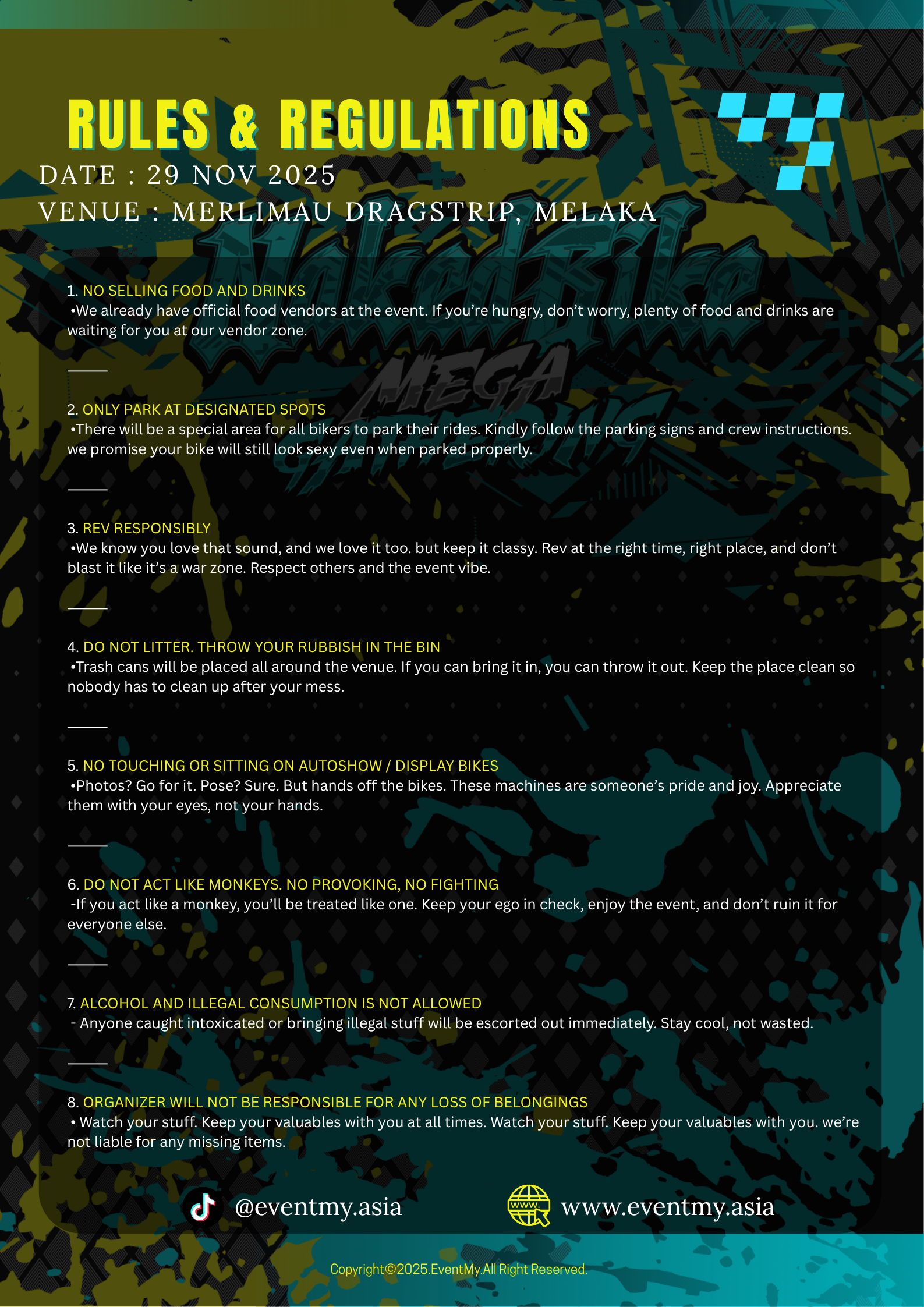 📝 Nota: Penyertaan ini hanya sah apabila dibeli bersama Pakej Pembelian Barangan Rasmi Naked Bike Mega Gathering sahaja.